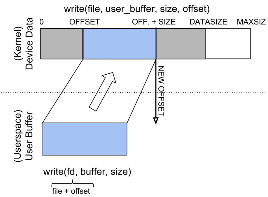 Ignore the offset parameter at this time. You can assume that the driver buffer is large enough. You do not need to check the validity of the write function size argument.