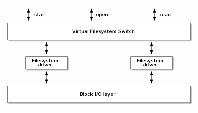 The following diagram shows a high level overview of how the file system drivers interact with the rest of the file system "stack". In order to support multiple filesystem types and instances Linux implements a large and complex subsystem that deals with filesystem management. This is called Virtual File System (or sometimes Virtual File Switch) and it is abbreviated with VFS.